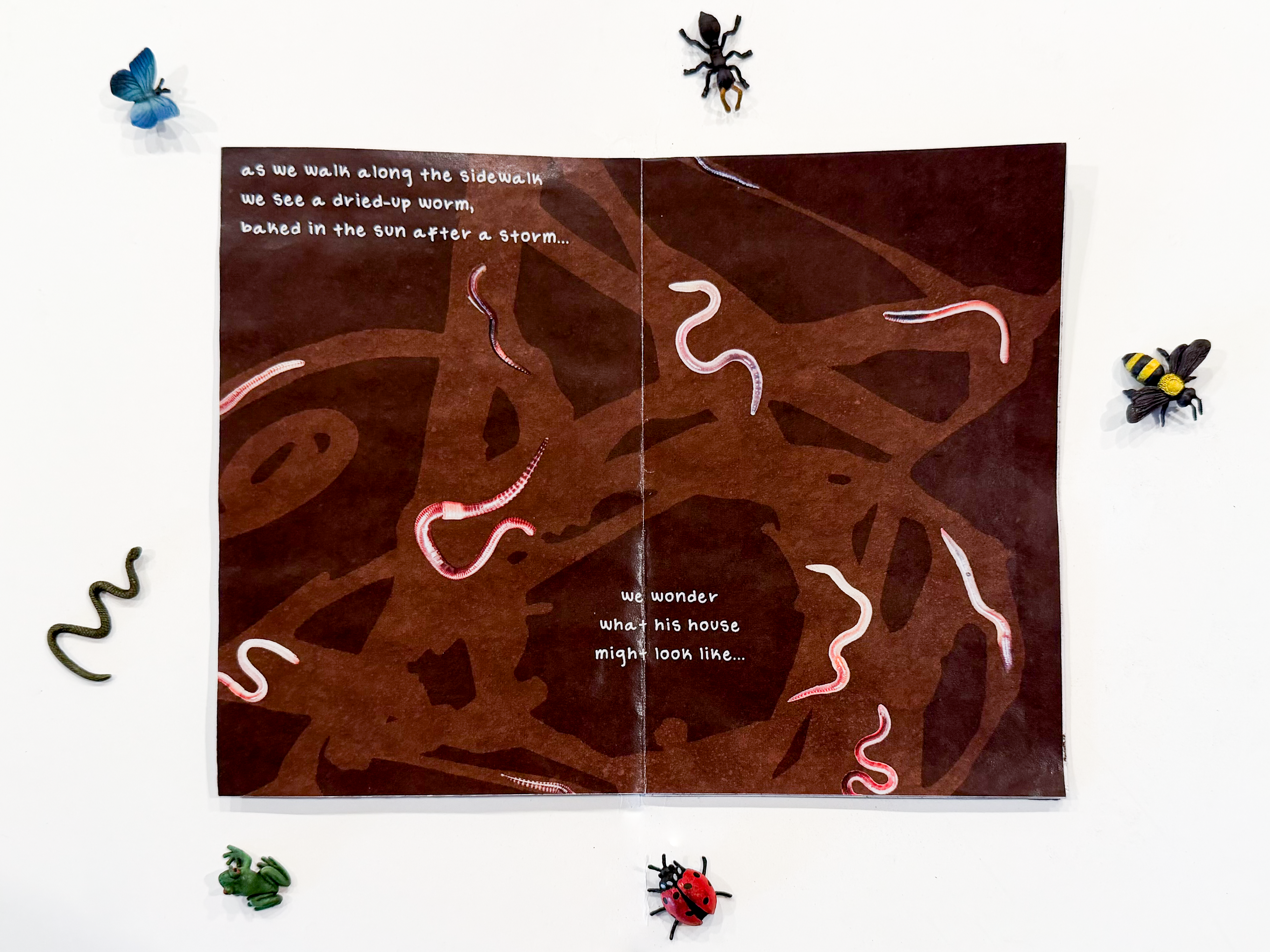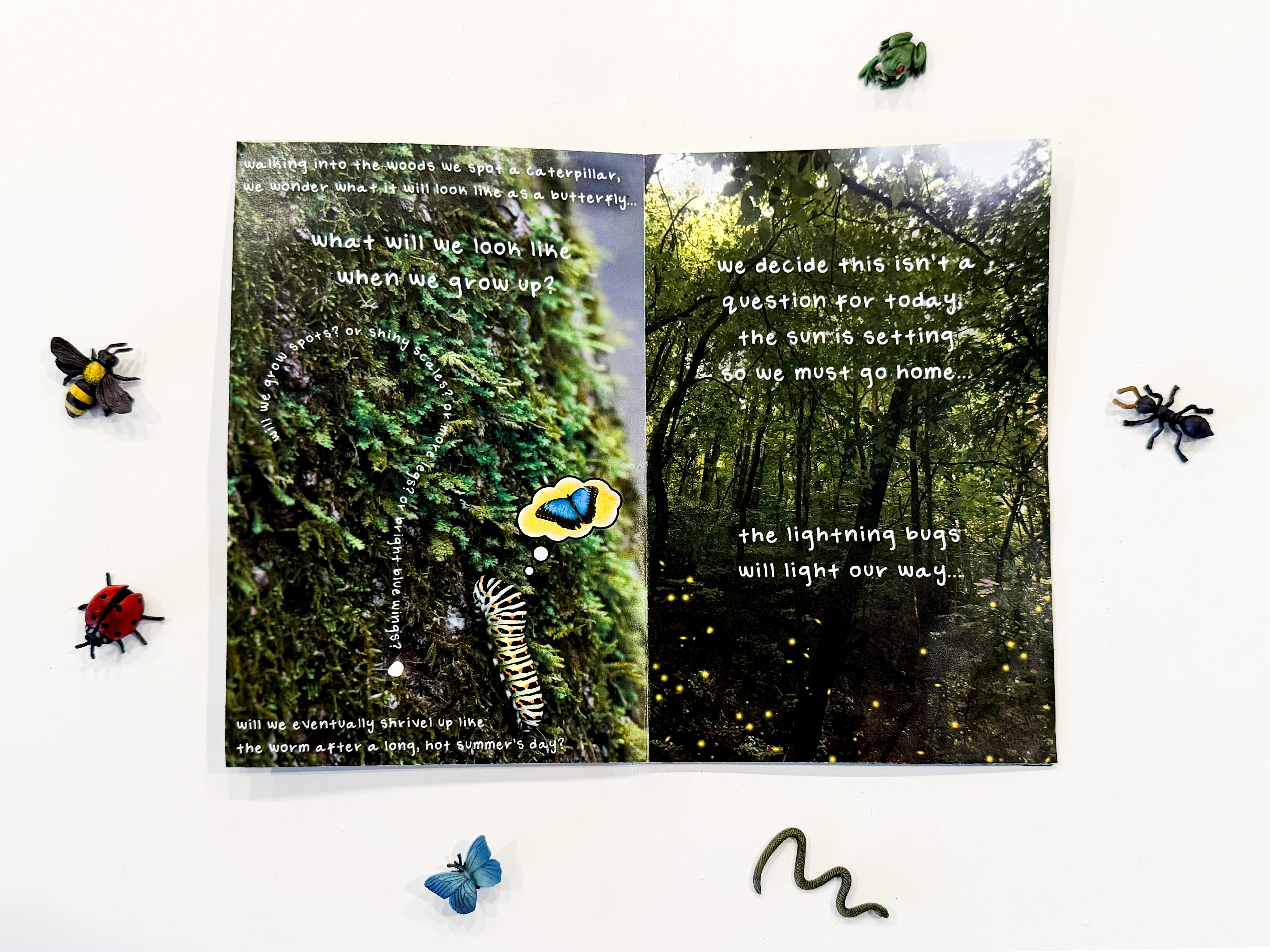 For my Surface studio, I was tasked to create a zine that explores negative/positive shapes and text. In order to complete this project I first had to create a wire head sculpture. From there, I made a negative/positive shape ink drawing. After that, I created a multimedia zine exploring themes of childhood memories and the process of growing up. Four pages of the zine had to incorporate photos of the wire head, which was used on pages 4, 5, 6, and 7. At least four pages had to explore materials and processes that I was interested in, so I chose digital photo manipulation. The text on the pages is my own handwriting that I turned into a typeface. I had a lot of fun with this project because it was a way to connect to my childhood again, while investigating a process that I love. This zine is housed in a wooden box filled with dirt and plastic bugs.