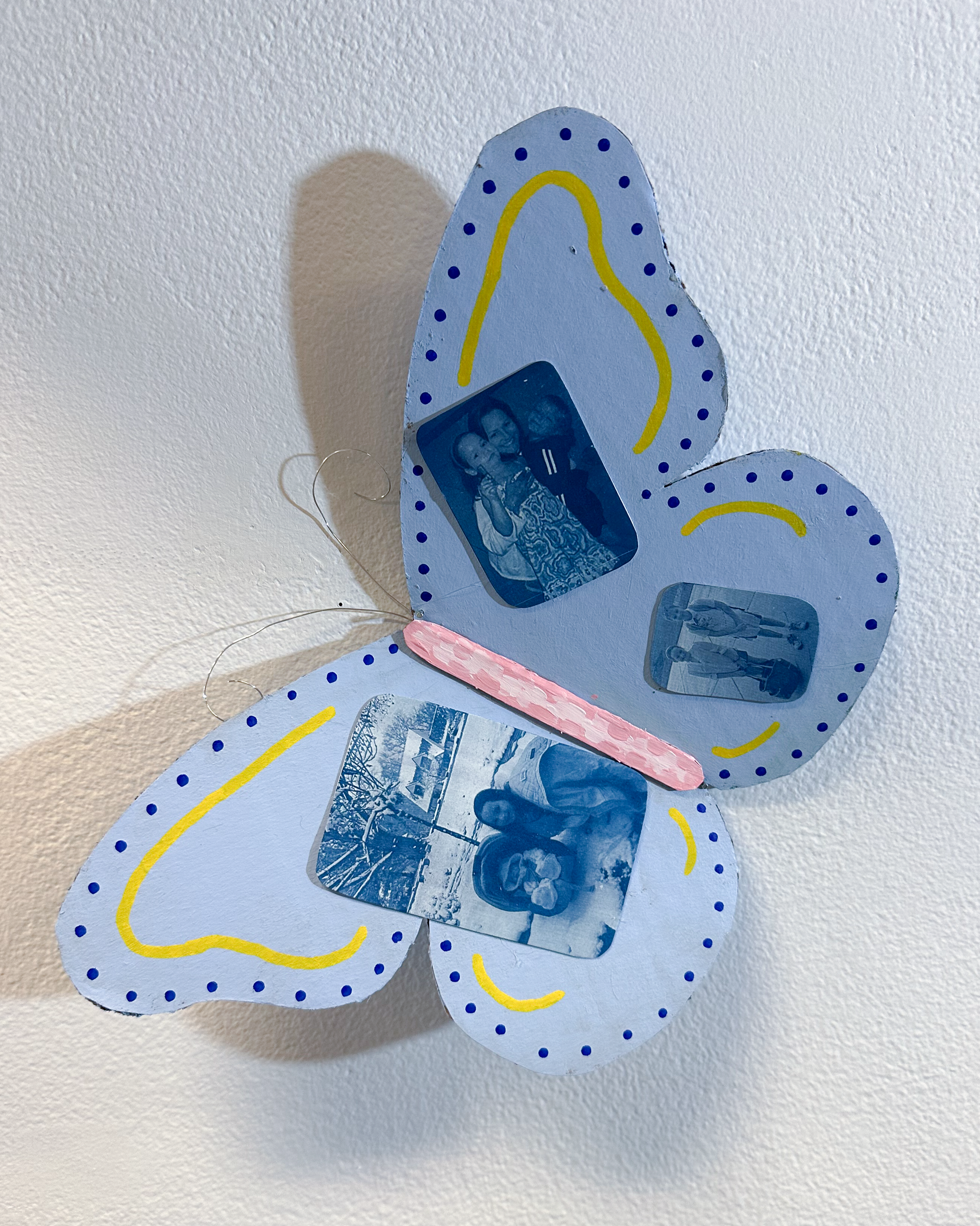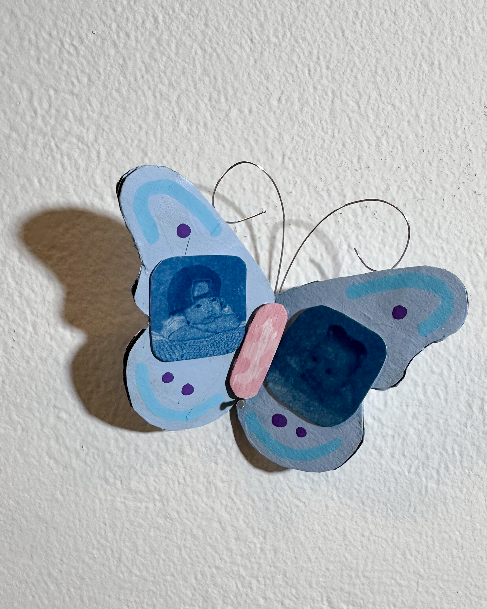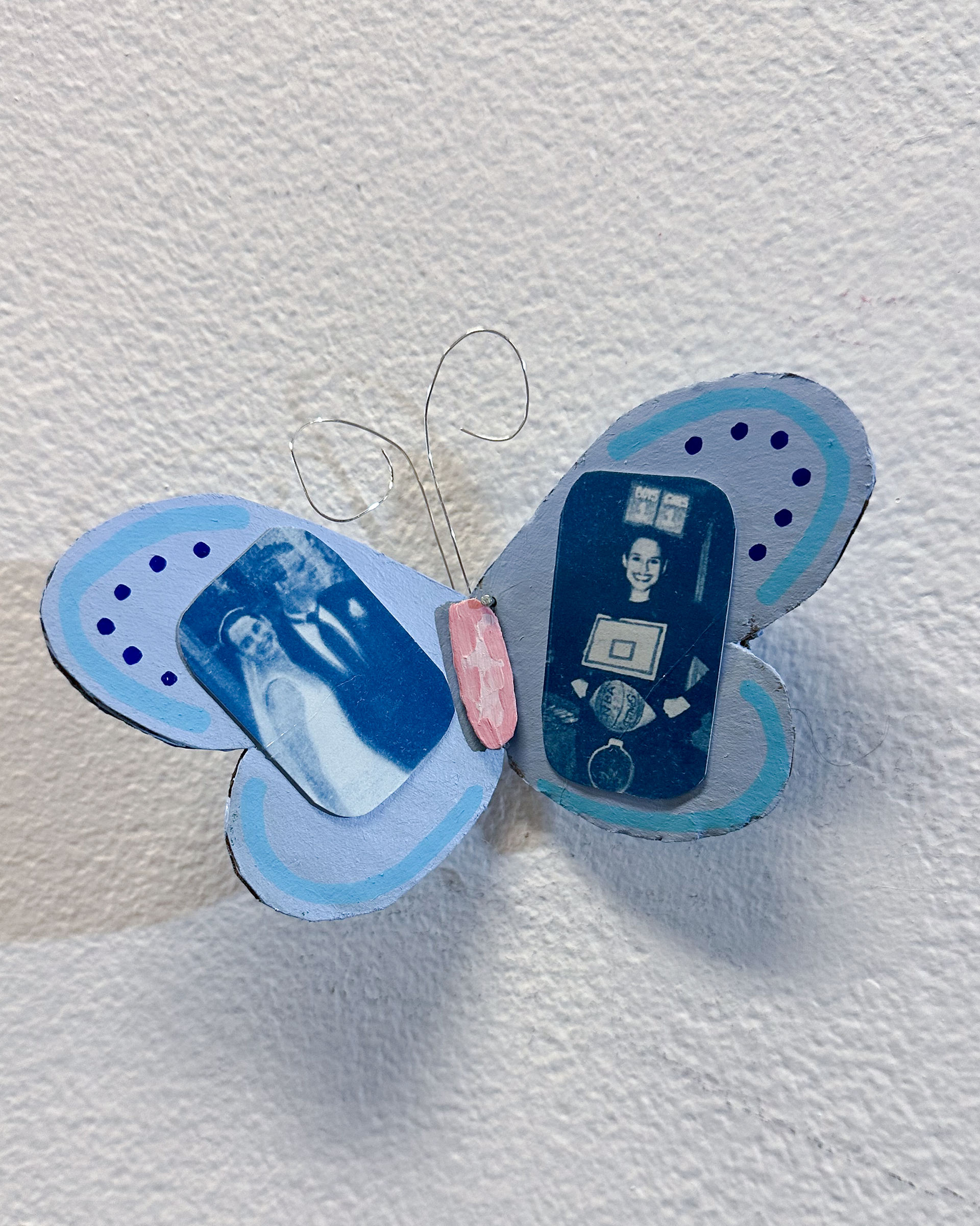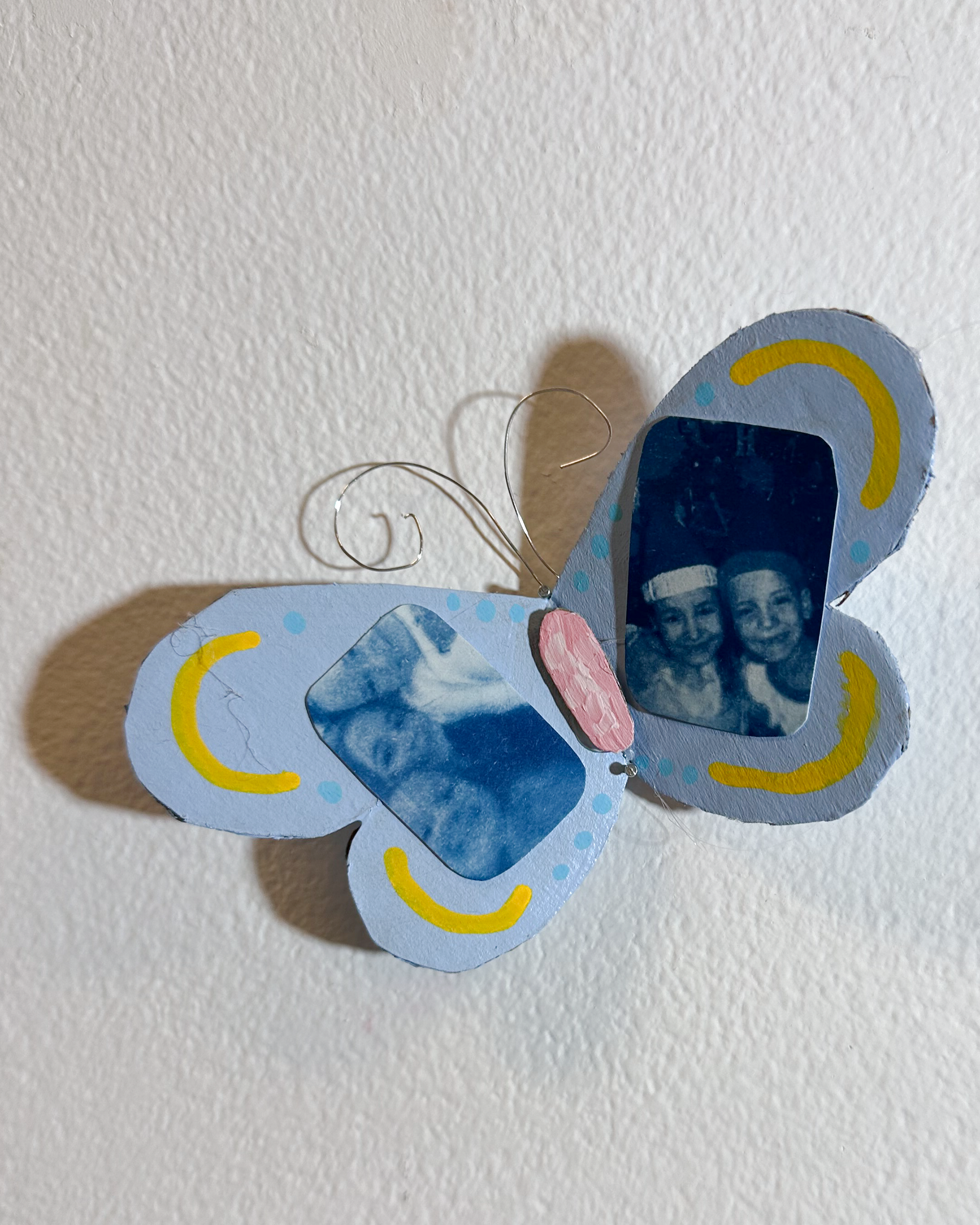 This project explores the grief that comes from growing up and leaving childhood. I created a mixed media piece that incorporated recycled materials including cardboard, wire, lace scraps, and an old book. I created many cyanotypes using a combination of childhood photos and portraits that I took of my family and friends. I thought a lot about using line and color to adorn the wings without taking away focus from the cyanotypes. I mixed colors, like the light blue and pinks, to compliment the cyanotypes and evoke a feeling of childlike whimsy. I created 22 butterflies total, one for each year I have been alive, and it spanned the entire 17 feet of space I was given. I installed the butterflies to create a swirling composition that leads your eye through the piece. This project is my way of confronting my complicated feelings surrounding the nostalgia and grief of growing up.