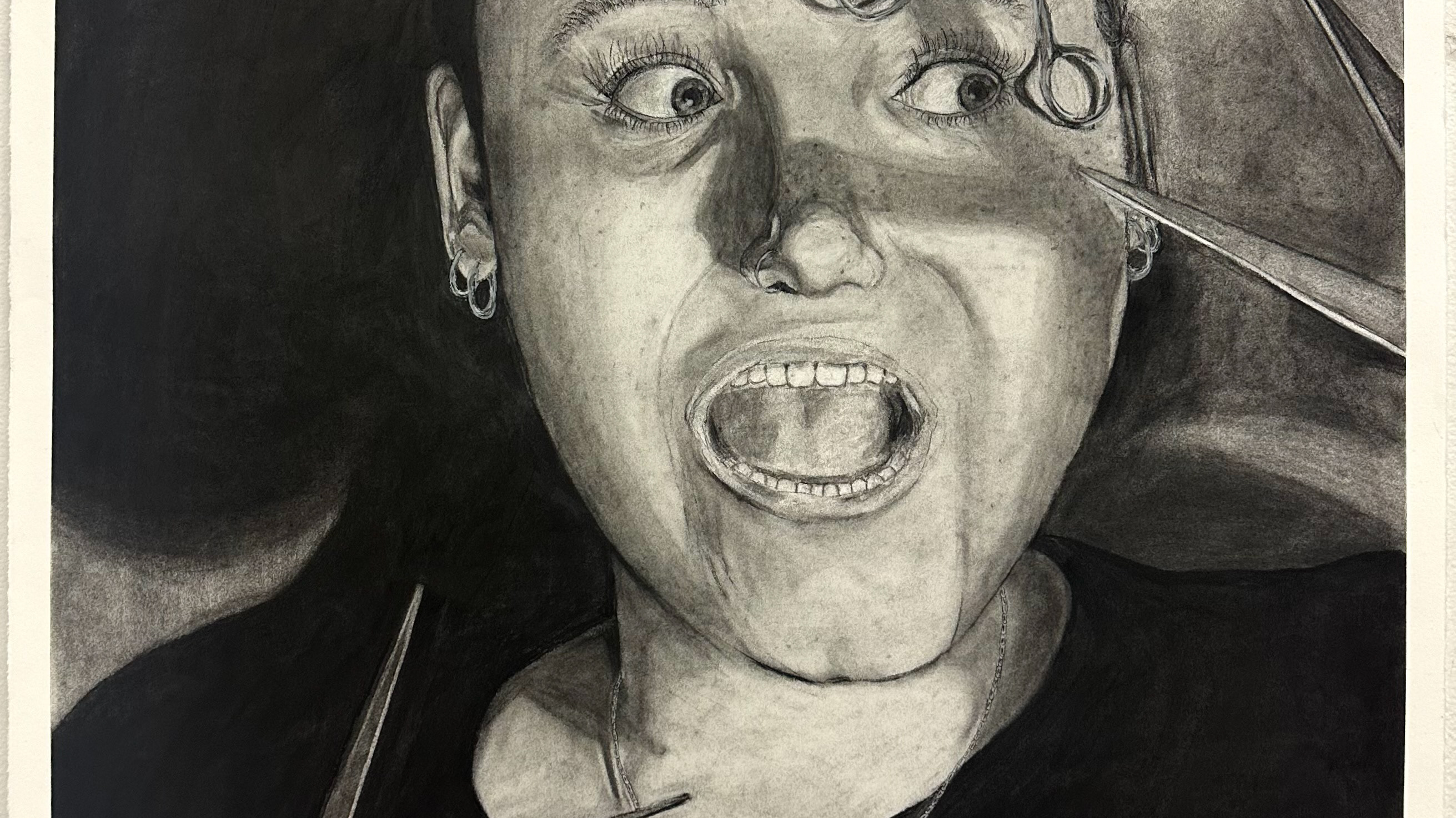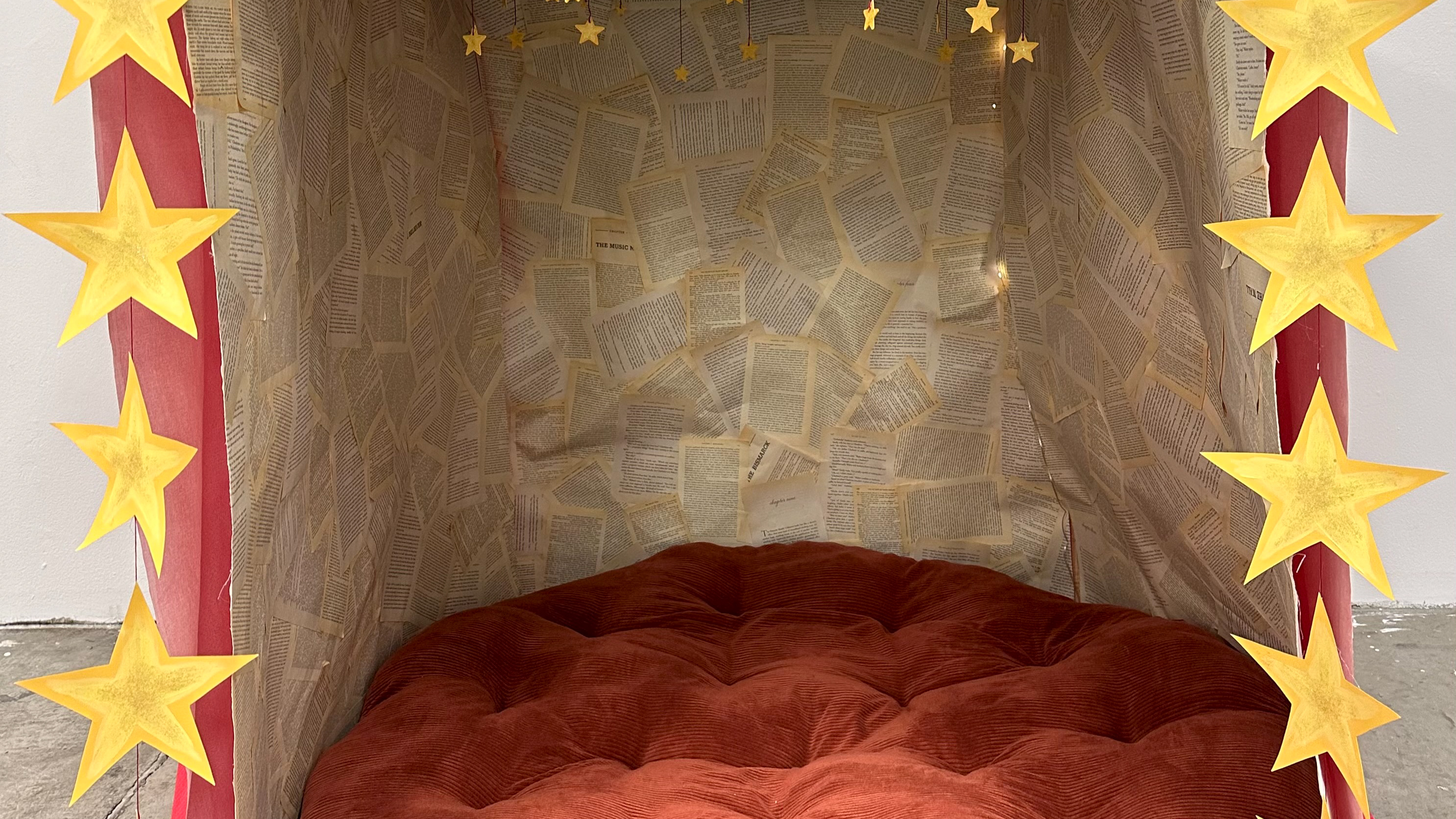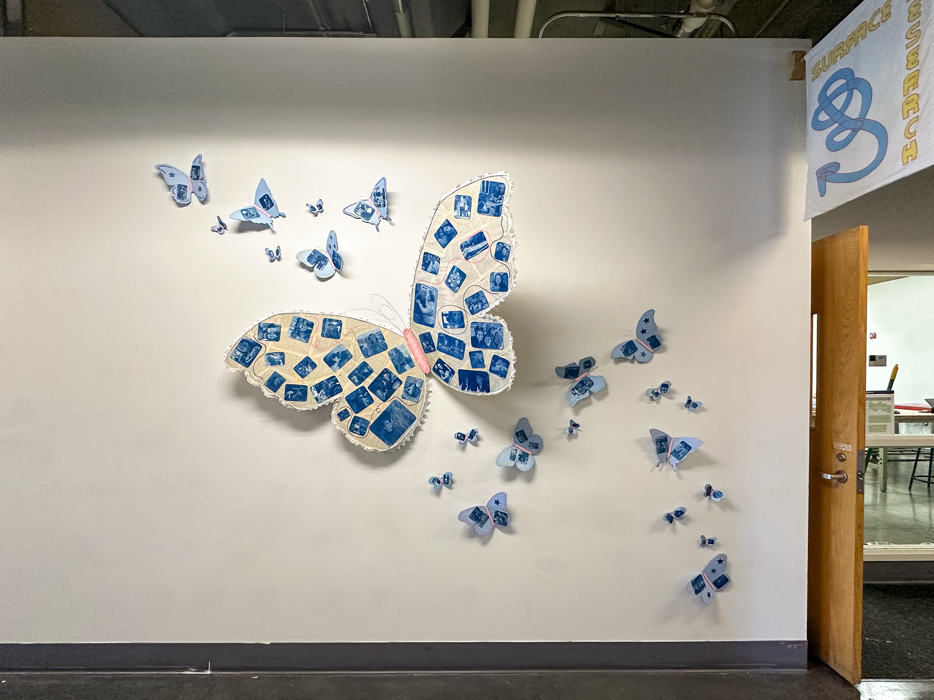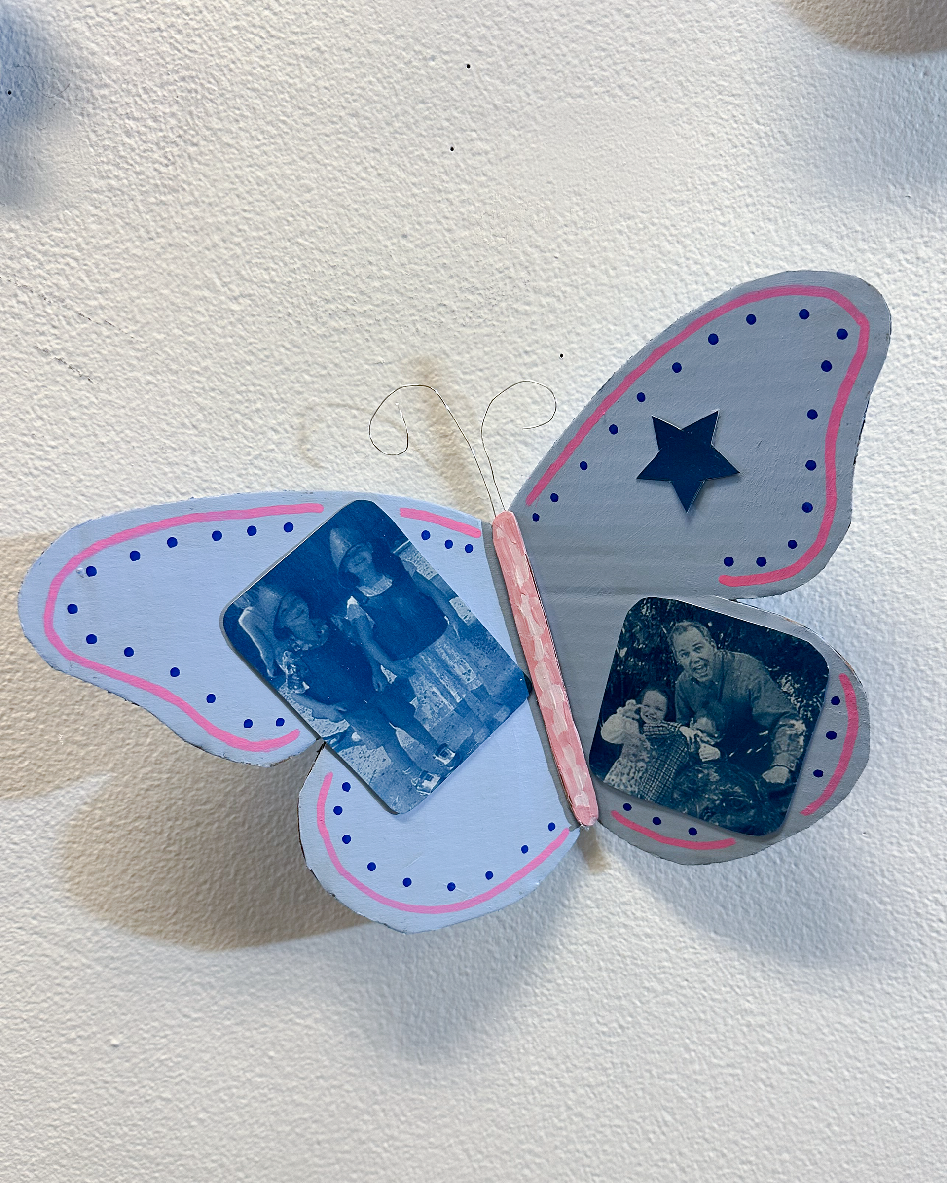 This project explores the grief that comes from growing up and leaving childhood. I created a mixed media piece that incorporated recycled materials including cardboard, wire, lace scraps, and an old book. I created many cyanotypes using a combination of childhood photos and portraits that I took of my family and friends. I thought a lot about using line and color to adorn the wings without taking away focus from the cyanotypes. I mixed colors, like the light blue and pinks, to compliment the cyanotypes and evoke a feeling of childlike whimsy. I created 22 butterflies total, one for each year I have been alive, and it spanned the entire 17 feet of space I was given. I installed the butterflies to create a swirling composition that leads your eye through the piece. This project is my way of confronting my complicated feelings surrounding the nostalgia and grief of growing up.